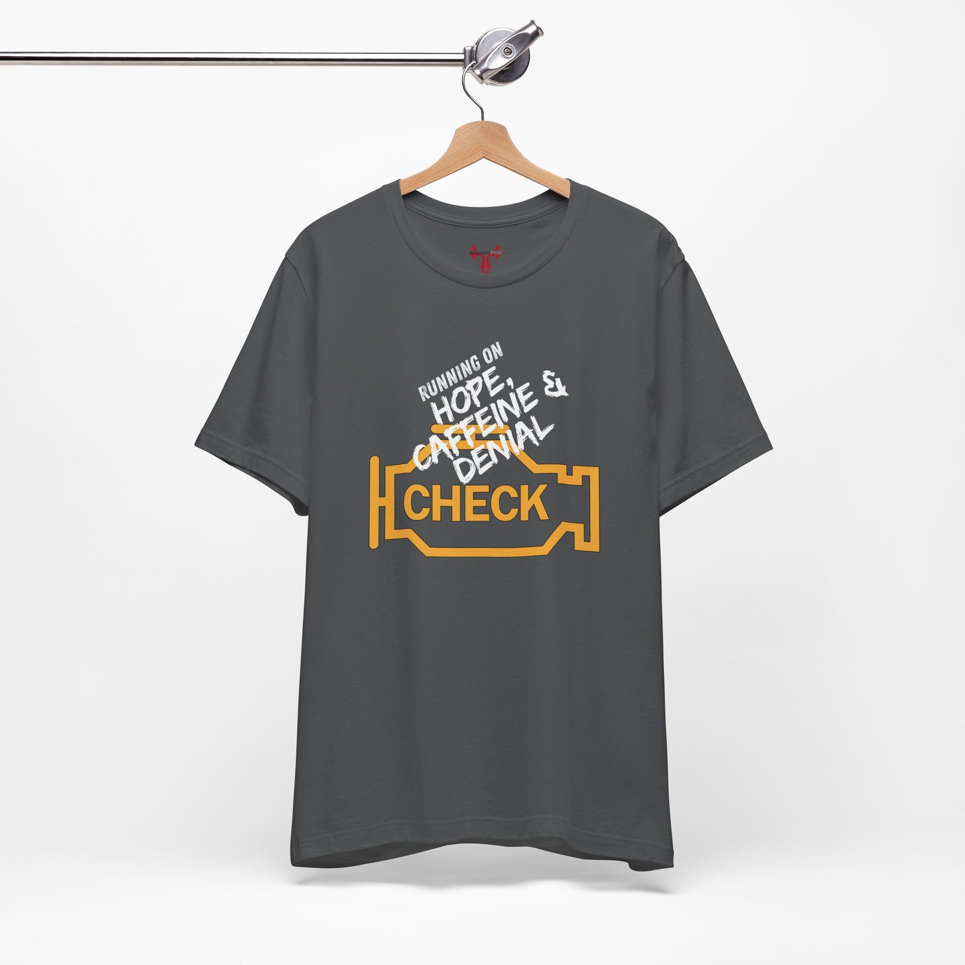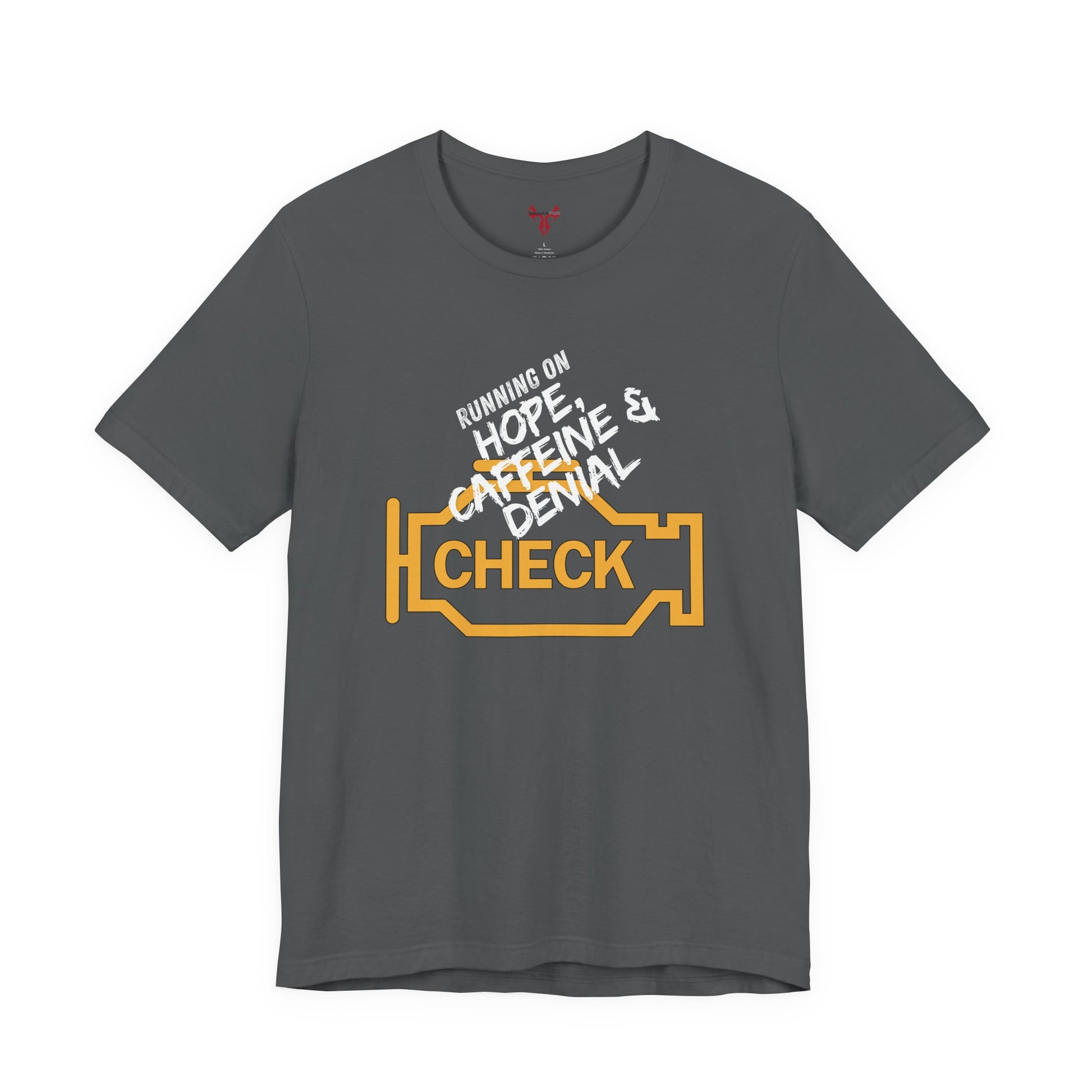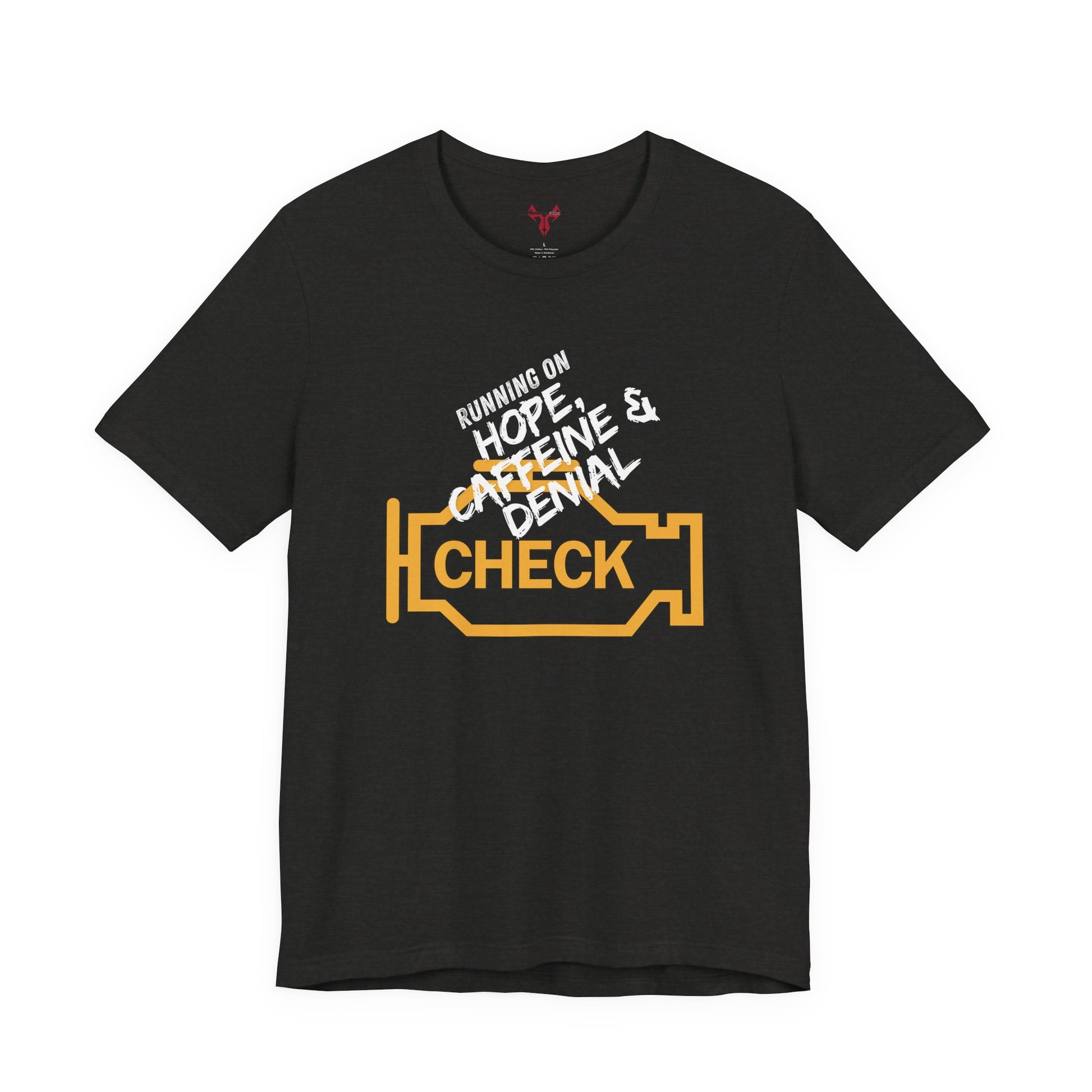 Running on hope, caffeine, and denial — the official fuel mix of getting through it. For the overworked, under-rested, and still somehow functioning. A daily reminder that burnout builds character… and probably heart palpitations.
